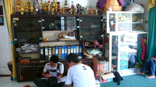 Kakak-kakak pengurus sanggar lagi sibuk ngurusin administrasi, ngabsenin, nyatet iuran, dlsb. Tampak belakang sederetan piala hasil capaian sanggar, bukti keseriusan pengelolaan sanggar tari.