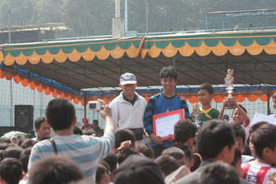 Oh ya.. ibu lupa cerita ya.. SSB Gajah ini dikelola oleh UPT olahraga Sekolah Gajah. Bahkan, ketua UPT pun salah seorang dosen di sekolah Gajah tersebut. Hadirnya para pejabat di lingkungan sekolah Gajah menunjukkan besarnya dukungan mereka pada turnamen tersebut. Saat pembagian hadiah, bergantian para pejabat sekolah Gajah memberikan hadiah untuk para pemain. Saat itu juga, ibu sempat duduk-duduk dekat dengan kepala UPT Olahraga dan mencuri dengar pembicaraannya dengan salah seorang pejabat sekolah Gajah. Sang kepala UPT sibuk menjelaskan prestasi yang sudah dicapai oleh SSB Gajah, bahwa tim ini merupakan tim andalan, tim inti, yang sengaja dibentuk, dan diberi porsi latihan tambahan, untuk mengejar prestasi. Bahwa, setelah 15 tahun penyelenggaraan, baru kali ini tim tuan rumah berhasil mencapai babak final. Bahwa mereka sudah melakukan pembinaan dengan lebih baik dibandingkan tahun-tahun sebelumnya. Sang pejabat mendengarkan dengan seksama dan sesekali mengangguk-angguk tanda setuju dengan ucapan sang kepala UPT.