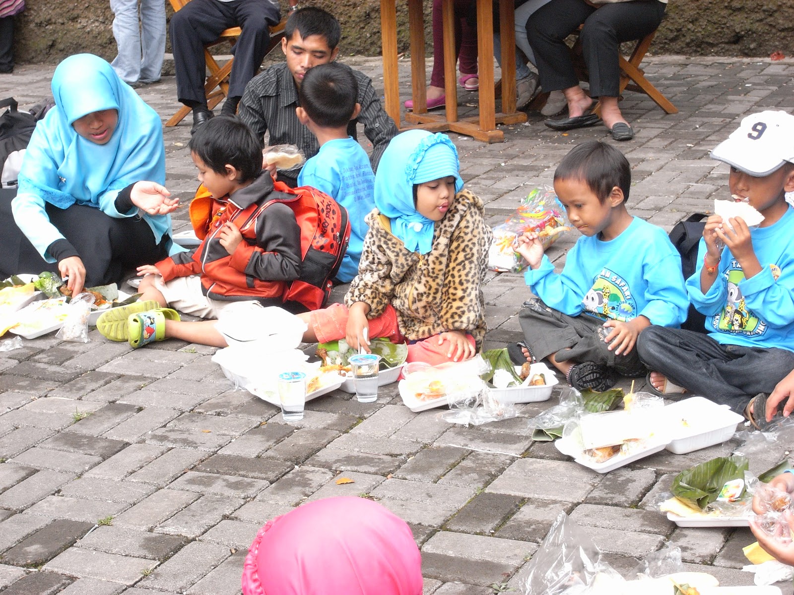 Menjelang jam 12, anak-anak sudah selesai memutari tempat satwa dan berkumpul di lapangan untuk makan siang.
