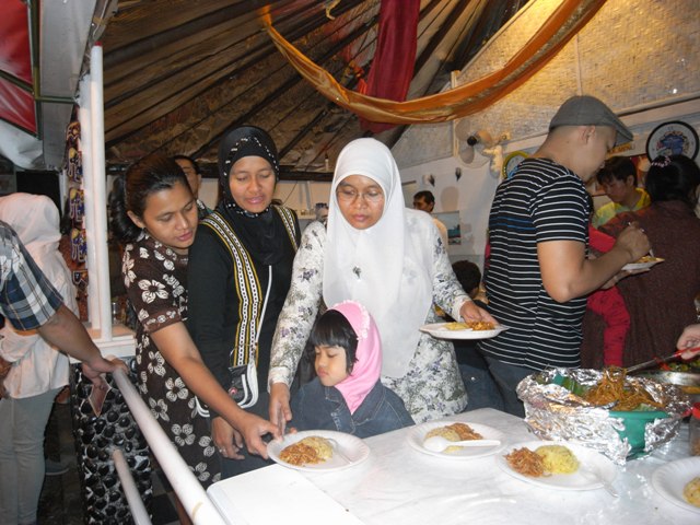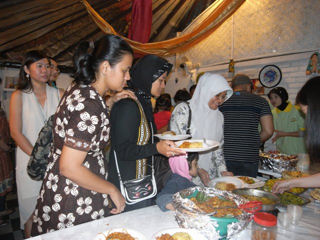 Jam 20.30 hidangan mulai disajikan. Tamu-tamu antri mencicipi hidangan. Modelnya kita boleh mencicipi apa saja. Antriannya cukup panjang looo, soale tamunya lumayan banyak.