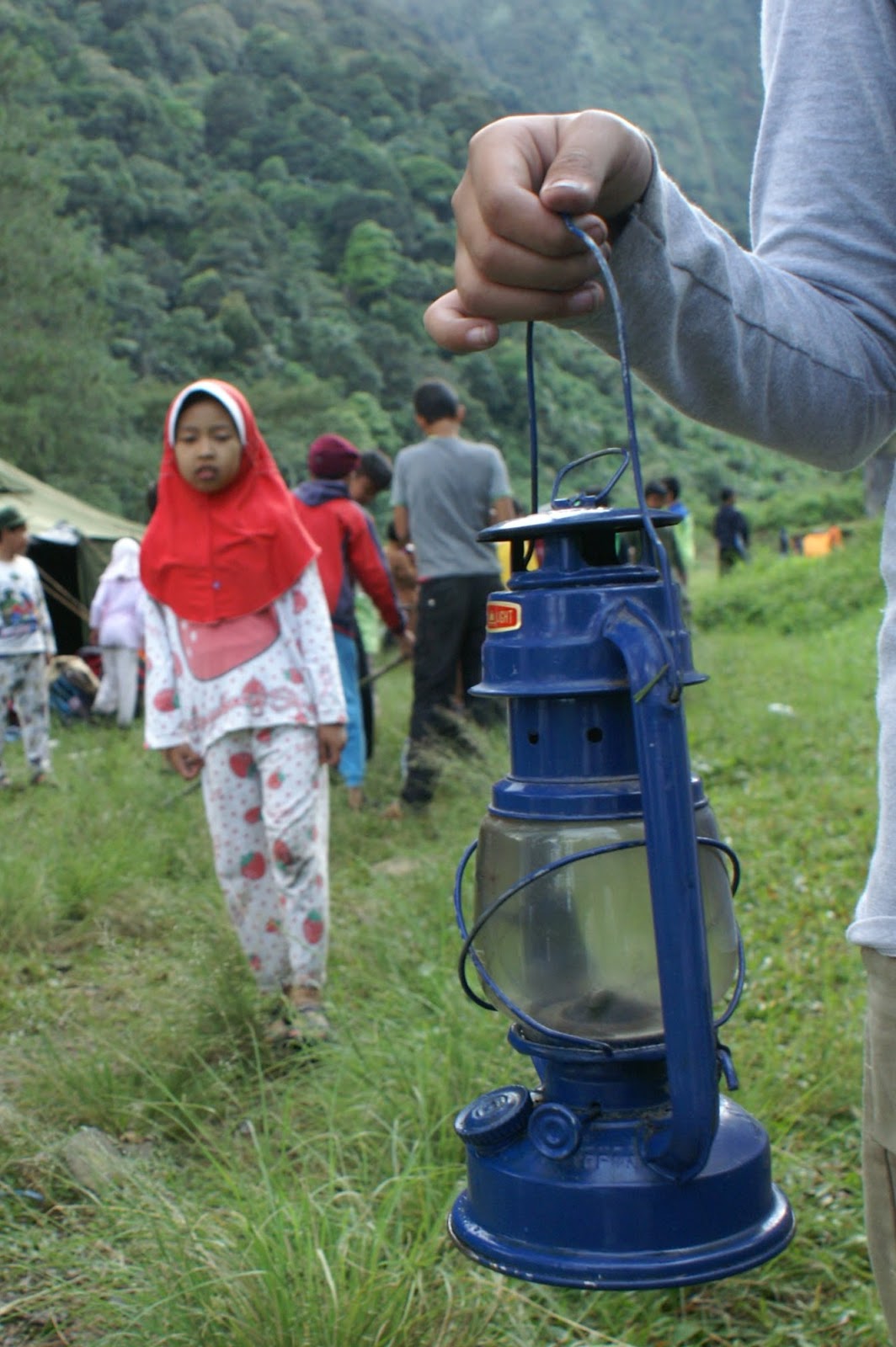 So, setelah memutuskan akan kemping, mulailah kita menggelar tenda. Sebenernya kita ditawari juga gabung dengan tenda guru-guru, tapi kita kan dah bawa tenda sendiri, jadilah buka tenda deket tenda guru. Guru-guru sudah menyediakan banyak lampu penerangan bertenaga batere, bentuknya kayak lampu cempor.