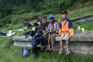 Kira-kira jam 5 an, adek ikutan bangun, rupanya karena mendengar suara anak-anak di luar. Segera ibu ajak ke luar, melihat suasana. Udaranya memang dingiin sekali, tapi lumayan segeer. Adek ikutan sibuk seperti anak-anak laennya, ikutan ingin maen "aer terjun", istilah adek buat pancuran. Jam 6 an, ibu siapin makan pagi buat adek. Nasinya ibu pake cadangan yang kemaren. Dingiin sih, tapi mau manasin nasi dimana? Lauknya? Yang praktis aja, telor rebus, kecap dan tempe bacem. Rupanya guru-guru juga udah sibuk masak dan nawarin lauk tambahan, sarden. Waah.. lumayan niih, mana masih anget-anget. Segeralah ibu tambahkan lauk sarden ke nasi adek. Untunglah adek nggak rewel soal makan. Setelah beres makan dan minum susu (yang satu ini anget pastinya, soalnya pake air panas, tadi malem abis refil termos ke guru-guru), adek ikut-ikutan dengan anak-anak maen-maen dan keliling-keliling. Karena udah siang, barulah keliatan situasi sekeliling kemah tersebut. Ternyata kita berkemah persis di samping kolam cinta. Tuh, anak-anak pada nangkring di tembok reruntuhan kolam cinta.