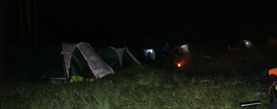 Dari tempat parkiran mobil jalan ke tempat kempingnya lumayan jauh, kira-kira 20 menit. Masalahnya jalannya gelaap bangett, mana lewat kayak jembatan gantung gitu, trus lewat pepohonan (ya namanya juga camping ground), jalan nanjak, barulah sampe ke arena kemping.