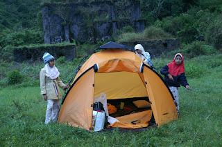 Nyenyak?? Boro-boro... makin malem makin susah tidur. Suara angin sangat kencang, seperti mesin menderu-deru.. whuiiii sereem banget deh, kalo nggak inget-inget kita tuh kempingnya banyakan, pastilah ibu dah kabur pengen pulang. Belum lagi, angin tersebut nggak sekedar kencang dan berisik, tapi dinginnya minta ampuun.. Ibu yang cuma berbekal jaket parasit maen bola kakak, yang sama sekali nggak layak buat di gunung, kepaksa mengkerut berusaha menghangatkan badan, menutup muka pake kaen adek. Angin ini juga menembus ke dalam tenda dan menerpa wajah dengan udara dingin setajam piso. Udara dinginnya tuh bener-bener kayak piso yang diirisin ke wajah.... Tiap kebangun, bolak-balik ibu meriksa adek, takut kenapa-kenapa.. takut kedinginan atau ketutupan selimut. Tapi Alhamdulillah.. adek tidur dengan tenang sampe pagi.